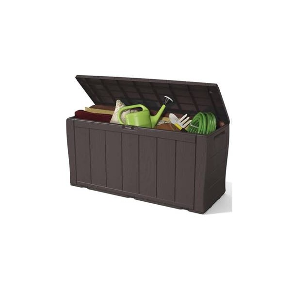 Πλαστικό μπαούλο αποθήκευσης με ξύλινη όψη, ιδανικό για εσωτερικούς και εξωτερικούς χώρους. Προσφέρει στεγανότητα και εξαερισμό στο περιεχόμενό του.