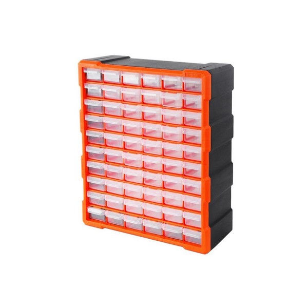 Συρταριέρα - κουτί αποθήκευσης της Tactix με 60 μικρά διάφανα συρτάρια με διαχωριστικά. Διαθέτει πίσω στοπ συρταριών το οποίο εμποδίζει το σκόρπισμα των αντικειμένων και μπροστινή λαβή δακτύλων. Κρεμιέται στον τοίχο και στοιβάζεται εύκολα. Μέγεθος: 38.5x16x48.5cm.